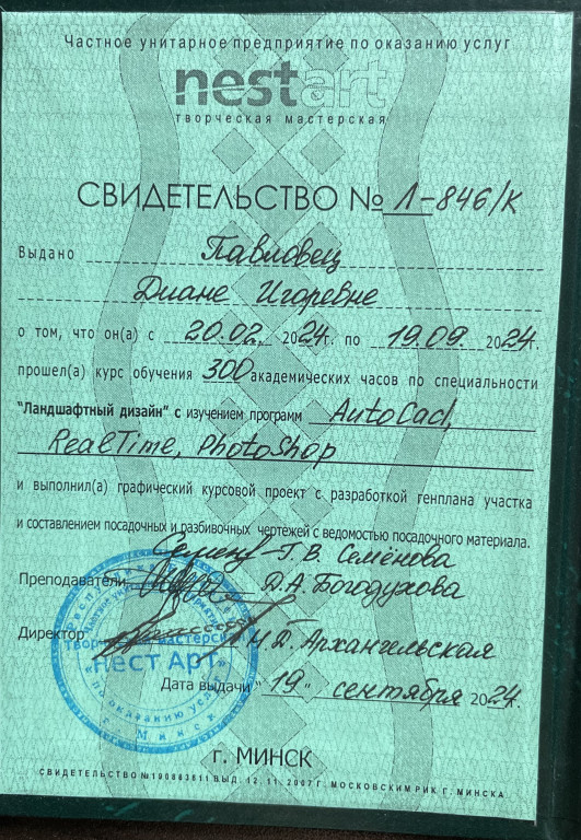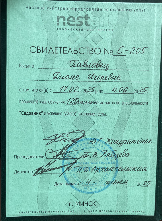 Прошла обучение на садовника и ландшафтного дизайнера в 2024-2025 году в творческой мастерской NESTART